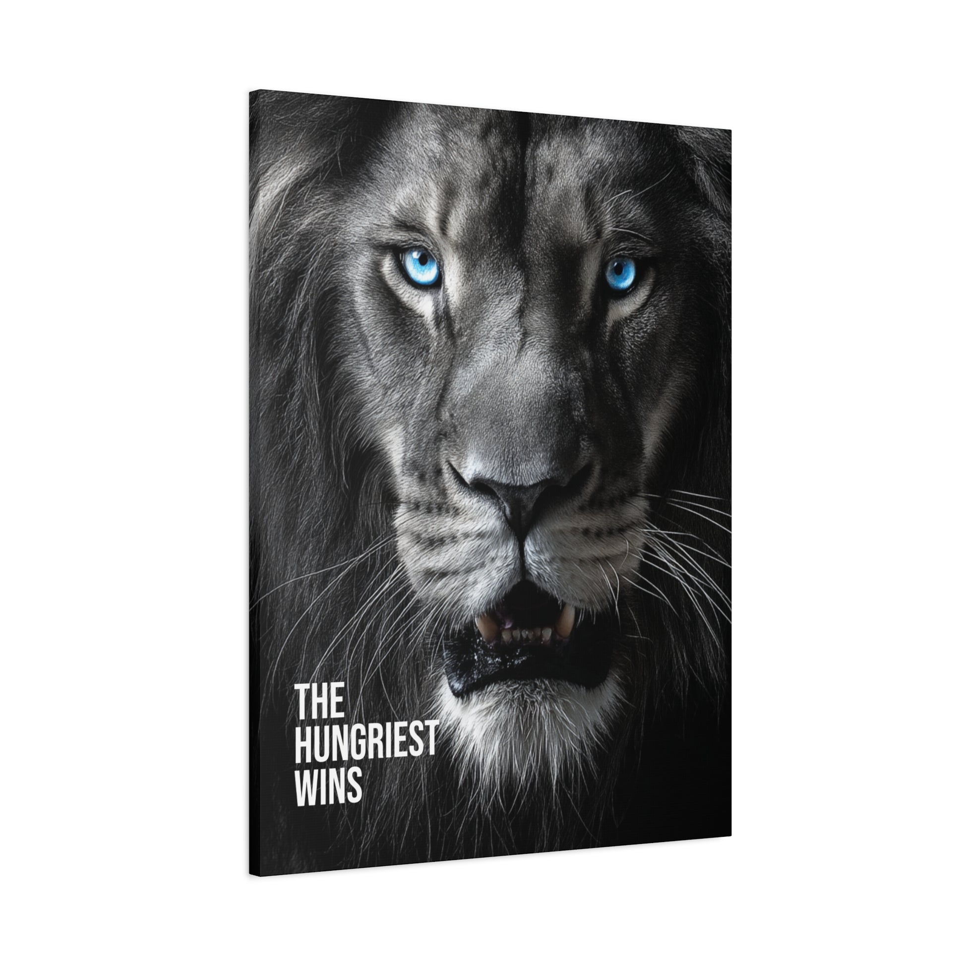 Canvas Print - Intense Lion Stare Down with Bright Blue Eyes 'The Hungriest Wins'